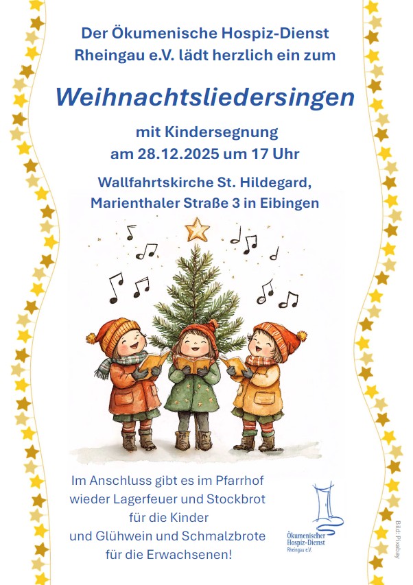 Unser alljährliches Weihnachtsliedersingen ist im ganzen Rheingau bekannt und beliebt. in der Wallfahrtskirche Sankt Hildegard in Eibingen sind Groß und Klein herzlich zum gemeinsamen Singen bekannter und beliebter Weihnachtslieder eingeladen. Im Anschluss genießen wir das gemeinsame Beisammensein bei Glühwein, Kinderpunsch, Schmalzbroten und Stockbrot am Lagerfeuer!